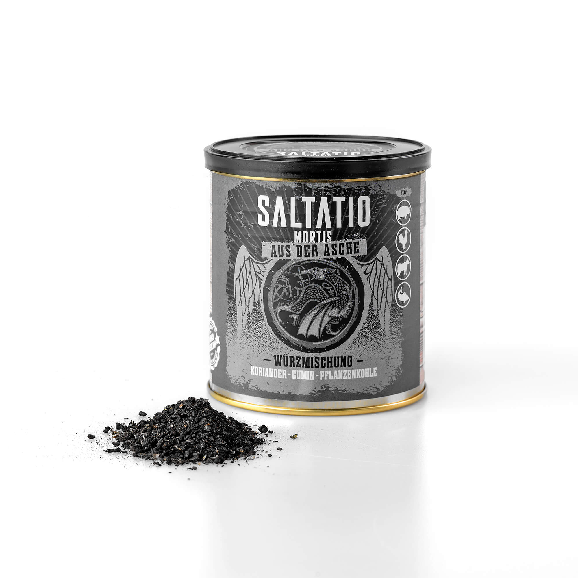 Schwarz wie Asche, so färbt diese außergewöhnliche Mischung leckerer Gewürze und Kräuter mit natürlicher Pflanzenkohle (und dem, was vom Publikum übrig bleibt, wenn unsere Pyroanlage angeht), Pfeffer und Meersalz bei Kontakt alles ein, was ihr so auf den Grill haut. Für den Showeffekt am Grill, das besondere Steak, Geflügel, Braten und Fisch, aber auch für Gemüse und Brot und als Finisher bei Tisch!